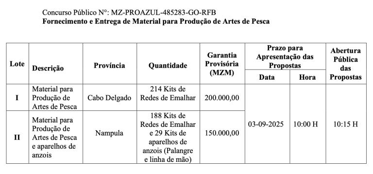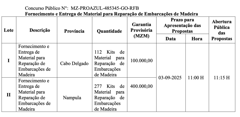 o Fundo de Desenvolvimento da Economia Azul FP, (ProAzul FP) convida empresas elegíveis, com alvará compatível ao objecto de contratação, a apresentar propostas seladas para o fornecimento e entrega de bens no âmbito da reposição de danos causados por eventos climáticos extremos, conforme se menciona a seguir: